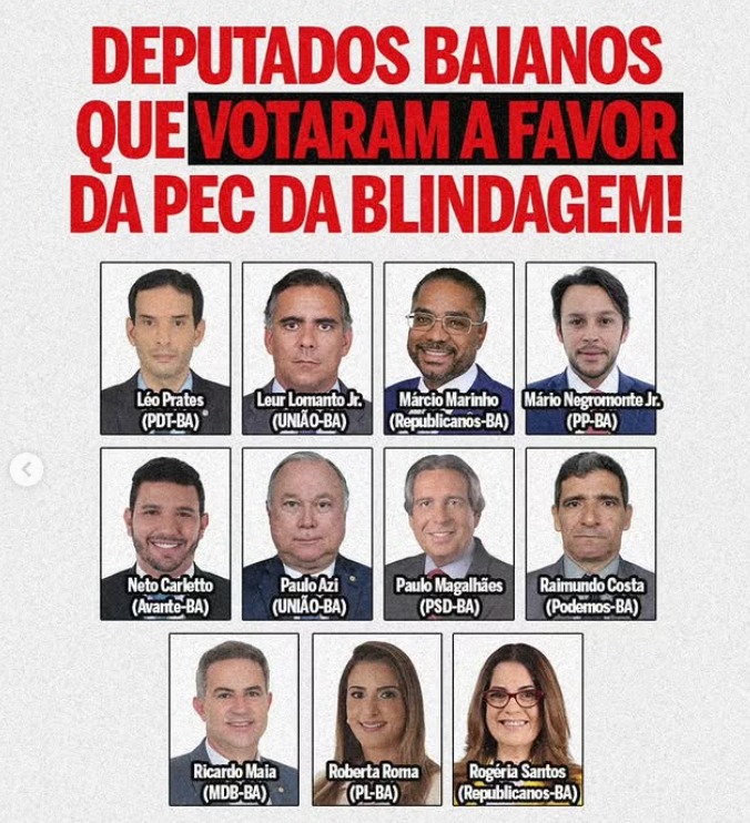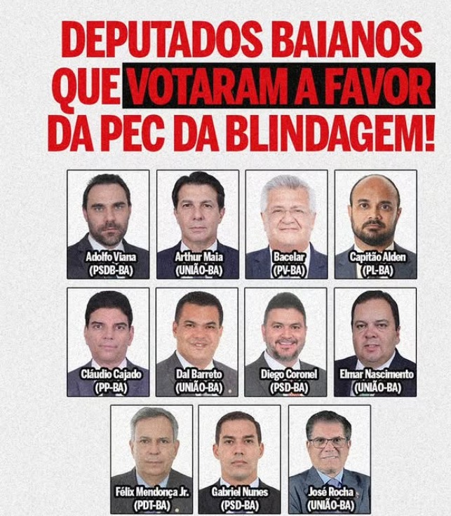 Dos 39 deputados federais da Bahia, 22 votaram a favor da PEC. Vale lembrar que são sempre os mesmos. Confira: Adolfo Viana (PSDB), Arthur Oliveira Maia (União Brasil), Bacelar (PV), Capitão Alden (PL), Cláudio Cajado (PP), Dal Barreto (União Brasil), Diego Coronel (PSD), Elmar Nascimento (União Brasil), Félix Mendonça Júnior (PDT), Gabriel Nunes (PSD), José Rocha (União Brasil), Leo Prates (PDT), Leur Lomanto Júnior (União Brasil), Márcio Marinho (Republicanos), Mário Negromonte Júnior (PP), Neto Carletto (Avante), Paulo Azi (União Brasil), Paulo Magalhães (PSD), Raimundo Costa (Podemos), Ricardo Maia (MDB), Roberta Roma (PL) e Rogéria Santos (Republicanos).